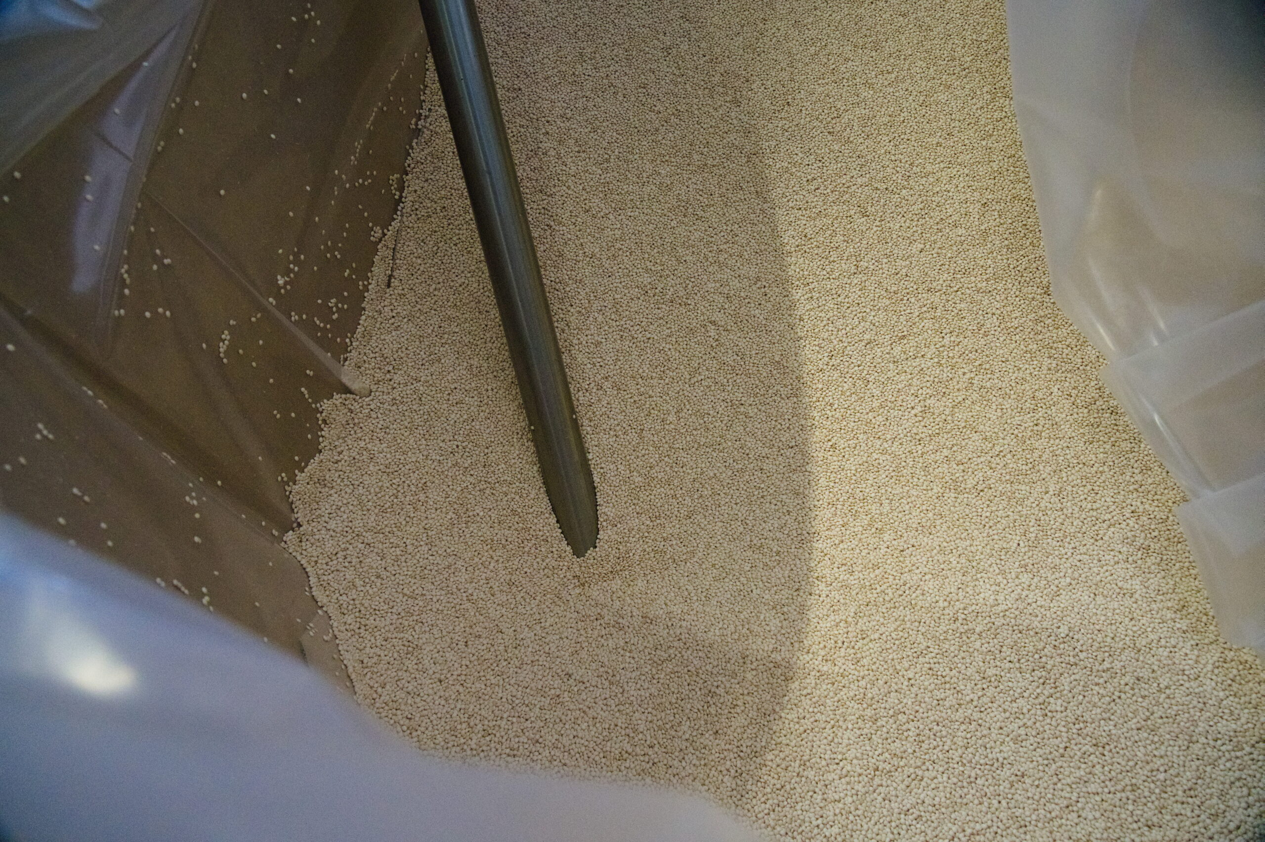 Successivamente Il biopolimero fuso viene estruso attraverso una matrice tonda che permetta la formazione di un tubo di plastica detto “bolla” tenuto gonfio con aria compressa.